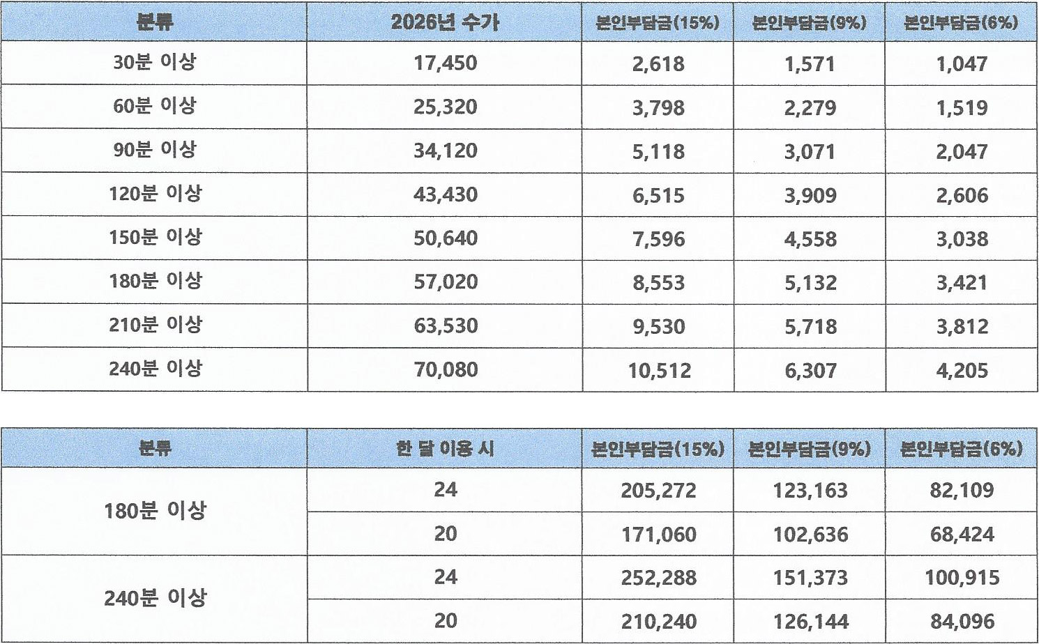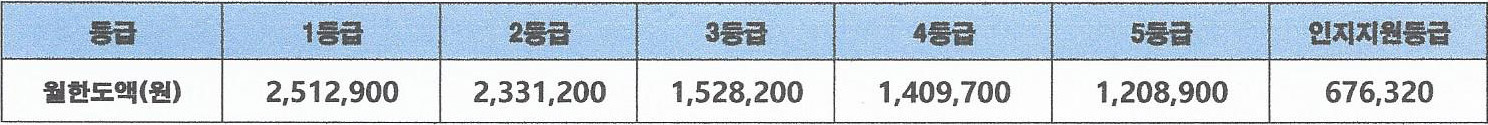 * 월 이용 한도액(공단 부담 85% + 본인 부담 15%)은 장기요양등급별로 지급하는 금액이며, 한도액 초과시 100% 본인부담입니다.